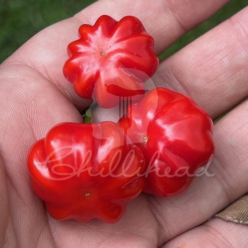 Brazilian Pumpkin chilli seeds. The Brazilian Pumpkin (C. Baccatum) is another one of those unusual looking chillies. It looks very similar to the Brazilian Starfish, but is a different cultivar in it’s own right. Plants have a more determined structure to them. The plants grow to a height of around 1,2m. Vertical growth with a definite tree like structure. Pods start out dark green and have a lovely undulated, starfish like shape when they first appear. As the pods grow, they do flesh out, becoming rounder, fuller with a more pumpkin like appearance. Once fully ripe, the pods ripen to beautiful red colour. Pod size is larger than it’s relative. Heat wise, the Brazilian Pumpkins are mild to medium. They have a lovely thick, crisp flesh that will add a lovely crisp crunch to any salad or salsa. Flavour wise, there is a lot of fresh citrus and peppery flavours. There’s a sweetness there too. Lovely peppers to snack on straight off the plant. Super for stuffing and pickling. These plants do – in typical baccatum fashion – take time to ripen. They are not as large a producer as the Brazilian Starfish, but the pods are far more appropriate for stuffing or pickling, given their size.