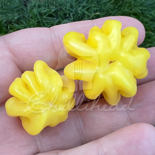 Brazillian Starfish Yellow Chilli Seeds. The Brazillian Starfish Yellow (C. Baccatum) is a colour variation on a a very unusual looking and popular chilli – the Brazillian Starfish Red. A consistent grower, this plant reaches around 80cm in height. Depending on growing conditions this may obviously vary. Our plants structure was quite wispy and sparse. An attractive plant, but what seems to stand out immediately is that this plant is a visibly sparser plant with fewer leaves and more of a wispy structure to the plant. Pods are about 5cm in diameter and have this undulated exterior with this very characteristic undulated fringe that runs around the outer edge of the pods that makes these pods look like little starfish of sorts. Hence the name. Pods ripen from green to yellow once fully ripened. These pods really do look very unusual and for this reason are tick all the right boxes as an ornamental. But these unusual pods are not just ornamental - they are mighty fine to eat too. Double surprise! These are somewhere in the ball park of Cherry Bomb / Ecuadorian Sweet. They are fruity and sweet smelling when cut open and have a wonderful sweet and fruity flavour. Pods are crisp and juicy when you bite into them. The burn on these is definitely front of the mouth. A pleasant lingering burn to these that lasts a good 5 - 8 mins. Heat on these is not staggering and can vary around Jalapenño level of heat and slightly up. Maybe in the ball park of a Serrano. So mild in our books, but very pleasant. This chilli would be really awesome in salsa, could be dried to make a lovely sweet paprika or made into sauce or a paste. Definitely a versatile chilli and one where the imagination will find an amazing use :)