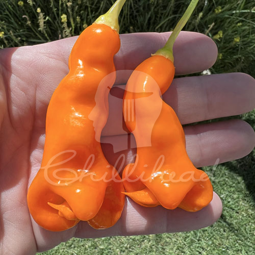 Good growers that produce very well. Pods ripen from a light green to brilliant orange late season. Pods range in size from 6 – 8cm in length. Pods are an irregular undulating pendant shape with a very shiny and smooth exterior skin. The pods also show a very distinct tail tucked into the folds of the apex of these pods, which is always a bonus among growers. As already mentioned, the pod shapes evoke a very sensual, erotic shape – hence the name. These pods like most Baccatums, will benefit with an early season start. Pods can take their time to fully ripen. This cultivar does not show signs of slowing down in our autumn weather, but instead can show signs of re-invigoration with cooler temps in the mornings.