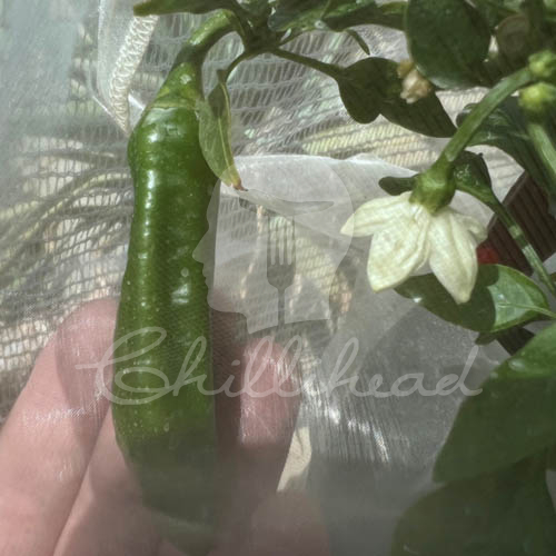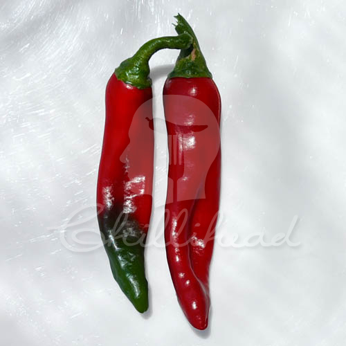 This cultivar is a small to medium paprika plant (40-60cm) which produces all year round, given the right conditions. In winter time, a good north facing sheltered spot in the garden – against a  sunny wall, will go down a treat. Pods are long (6-8cm) with a slight undulation. Pods ripen from dark green to a brilliant red colour and are best suited for drying and manufacturing into chilli (paprika) powder. These pods dry very well and can be manufactured into a lovely rich dark red paprika powder.