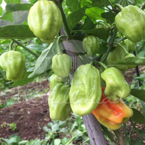 Haba Gambia chilli seeds. The Haba Gambia (C. Chinense) is said to originate from Gambia - hence the name. This variety of Habanero are great growers. Plants grow to about 60cm in height. Compact, bushy - typically Habanero structure to these plants. In our experience this variety is a great producer, producing large pods that are larger than a golf ball - so quite large pods! Pods are smooth and folded on the exterior and full of placenta on the inside. Pods ripen from a pale lime green to orange and ultimately a bright red colour. The aroma on these is citrus and sweet. These pods are thick walled and very juicy. Heat is pretty much instantaneous, with a up there Habanero heat. Flavour is sweet, fruity and delicious! A great Habanero variety that can be used fresh in salsas or to make sauce or to use in hot stews etc.