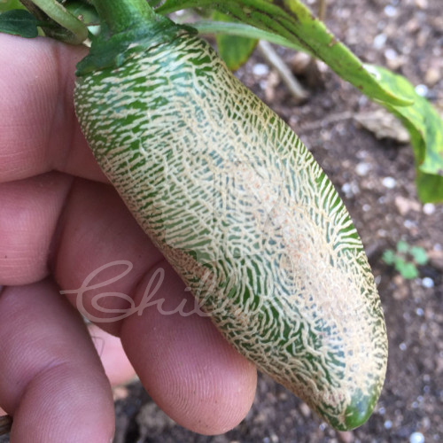 Jalapeño Farmers Market Potato Chilli Seeds. The Jalapeño Farmers Market Potato (C. Annuum) is probably the oddest looking pod in the Jalapeño stable of chillies. This variety has medium to extreme corking on the outside. Some people say this is ugly, but we think these are truly beautiful. Corking is quite a common phenomina on Jalapeños, but this variety has quite a lot of corking that can in extreme cases look like the corking on the outside of a cantaloupe melon which gives these pods a dusty grown earthy colour like a potato. Cut these pods open and a beautiful dark red flessh is revealed. These pods are thick, plump and juicy and really quite sensational flavourwise. The flavour profile is rich Jalapeño flavour with a minerally earthiness. Really quite unusual. The corking is variable on these chillies.