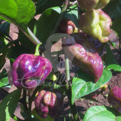 Maldavian Heart X Purple Bhut Chilli Seeds. The Maldavian Heart X Purple Bhut (C. Chinense) is a really unusual, beautiful cross between two chinense varieties. The Maldavian Heart is a hot Habanero variety that originates from the Maldives. The Purple Bhut being a purple strain of an old classic - the Ghost Pepper - India's hottest chilli. What makes this variety so special is its pure showmanship. This plant grows well to a height of around 60 - 70cm. Foliage on these plants is dense and leaves are green with amazing dark green/purple veins and stems/branches. Flowers too on this plant are quite exraordinary with a kind of mauve colouring to them. But most spectacular of all is the colour changes of the pods. Pods will change from a unusual purple/green to purple to orange/purple and finally a lovely red withl darker blushes of deep red. It is quite spectacular to see these plants change all the time. We do not believe that this variety is a totally stable variety as pheno type does fluctuate on these - some showing a more Bhut Jolokia pheno trait and others a smoother, larger habanero appearance. The smell and flavour on these is fruity, citrus and slightly floral. The heat is not superhot, but up there 600,000 - 800,000 SHU. The burn is front of mouth and well rounded with a great lingering burn. A really awesome chilli variety to grow that may yet have surprises up its sleeve in future generations. So if you are interested in growing something that may just reveal an amazing variety further down the line - this is a great choice!