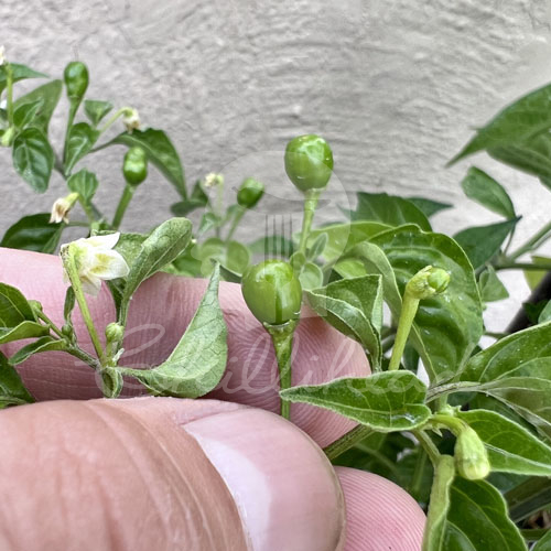 This is an easy germinator when it comes to wild chillies, certainly when it comes to wild cultivars. The pea is also one of those happy go lucky plants that just seems to get on with things without much fuss. Plants will grow to an average height of 1 – 1,2m. Plants may well grow larger if grown in the soil or larger containers. So a medium to potentially large cultivar. Plant structure is bushy. Flowers are typically Baccatum with beautiful white flowers with yellow/green blotches on the corolla. Flowers are very much smaller though than the domesticated Baccatums. Flowers give way to small pea sized pods that vary in shape from oval to round. Colour of pods change from green to orange when fully ripe. This cultivar does produce an abundant crop of little upward (facing heaven) pods. Pods are very much like Tepin pods.