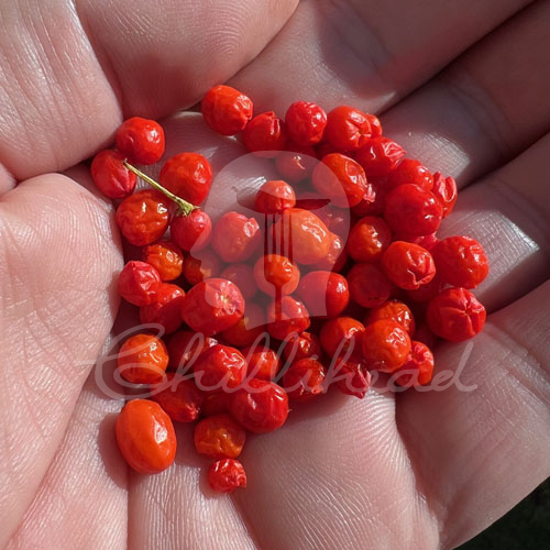 The calyx on the pods is not pronounced like many of the wilds but more like an Annuum calyx. Once pods turn orange, they do have an interesting attribute of easily separating from the calyx. In keeping with most wild chillies, the Pea is thin fleshed and very seedy. The interior of the of the pods, while seedy, is quite juicy given its size. The skin of the pods is quite hard/tough.