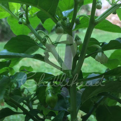 These small to medium sized plants are suitable for garden and container growing. Seedlings grow into nice compact bushy low slung plants with an average height of around 50cm. Plants yield very nicely in our experience. Pods start off green and ripen through orange to a lovely fire engine red once fully ripe. Pods are essentially heart shaped with slight undulations/folds. Pods are fleshy and crunchy with a super fruity aroma. We noted a slight minerally / sulphur smell on these which was unusual but not offensive. Flavour is very fruity with hints of citrus. The burn on these pods is intense with a strong burn around the mouth. The burn is typically chinense. Immediate, intense and quick to subside. This may be out of the comfort zone for most people. These chillies are no strangers in the kitchen. Used sparingly in cooking, these chillies add instant heat to a dish. Pods can be dried and turned into powder, or used fresh to make a very hot chilli sauce or salsa.
