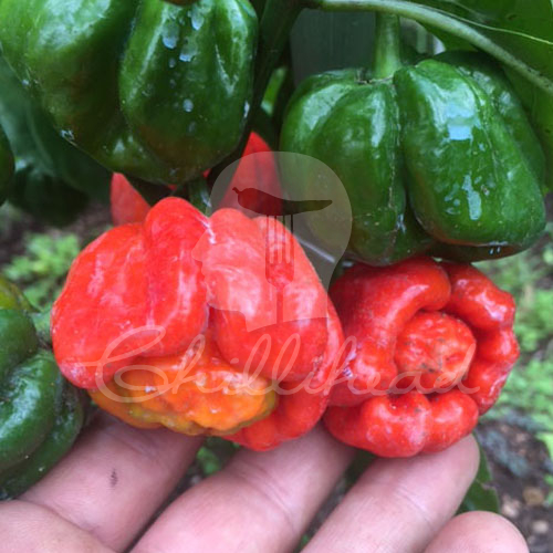 Scotch Bonnet MoA chilli seeds. The Scotch Bonnet MoA (C. Chinense) is an icon among chillies. This variety comes straight from the Ministry of Agriculture (MoA) in the Caribbean. These can be tricky to grow and it all has to do with the conditions you provide. This variety do like hot humid conditions and once established will grow well without fuss. What a wonderful variety of Scotch Bonnet these are! Big strong plants yielding lots of super large Scotch Bonnet pods. These pods are very iconic and easily recognizable with their four outer lobes and middle bulge. Pods are massive and ripen from dark green to red. The pods are slightly lumpy on the outside and just full of placenta on the inside. The aroma and flavour on these is just irresistible! Amazing sweet, fruity aroma and flavour - fantastic burn and heat! These pods are up there with the hot Habaneros, but if you are one of those people who does not like Habaneros, these chinense have a different flavour profile. No hiccups here either - just pure eating pleasure. They like their chillies hot in the Caribbean and this ticks all the boxes. It's beautiful and not just big - but big on flavour and heat too. Super for eating raw in salsas, super for sauce, great for cooking, super for powder. If you try any Scotch Bonnets this season - the Scotch Bonnet MoA has to be on the list for sure!