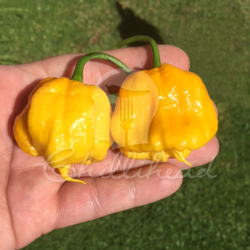 Trinidad 7Pot Primo Yellow Chilli Seeds. The Trinidad 7Pot Primo Yellow (C. Chinense) has to be one of those absolute gems in the superhot category. Named after the creator of this variety Troy Primeaux - nicknamed Primo. These seeds came to us as Trinidad 7Pot Primo Orange seeds, but we do feel that yellow is a better description of this variety as they only turn orange once over ripened. These pods will still be yellow when ready to pick and eat. This variety is a strong grower, producing large chinense style plant growth. This variety produces a large plant that easily will reach 110 cm give or take. A large strong plant with large leaves and a massive producer of pods. Pods are large and as wicked as you will ever find. Primo pods are characterised by the tails that they produce - some of the tails can be very long and pronounced. Lumpy bumpy pods that spell out what lies inside. We had to support our plants due to the sheer weight of the pods on the plant. Pods ripen from green to a magnificent yellow colour. Pods ripen from green to yellow and ultimately will turn orange if left to ripen fully and if dehydrated to make powder. Lots of placenta and capsaicin in these pods. An amazing fruity, sweet, floral aroma - with a citrus, fruity flavour. The heat on these is pretty instant. A very painful and intense burn from these. The heat is untested but way up high in our estimation. This has to be one of those MUST GROW kind of chillies in our book. A totally spectacular suporthot variety that is very versatile in the kitchen too.