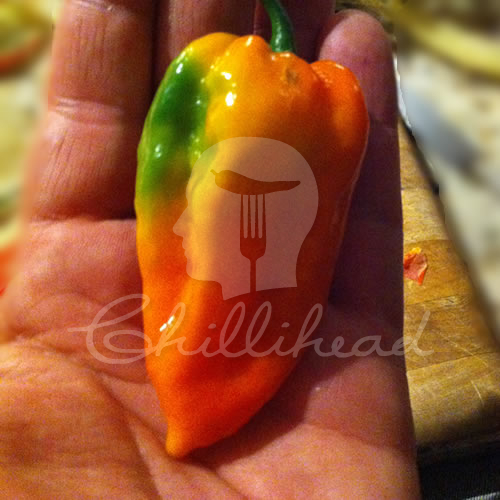 Trinidad Scorpion ButchT X Bhut Jolokia Chilli Seeds. A hybrid between a TS ButchT & Bhut Jolokia. Heat is somewhere between 800,000 to 1,300,000 SHU. It is a medium size plant, growing to about 1,2m x 0,5m x 0,5m. Easy growing. Fast growing and prolific podder. Pods are huge. Ripening from a dark green to an iridescent off red/orange colour. Plant yields plenty tear drop shaped, wrinkled pods that are thin skinned and hollow - yet crisp in texture. The heat on these pods is severe giving an ulcerating stinging tongue experienced with the ButchT and the lengthy lingering burn of the Bhut Jolokia. Taste is extremely fruity with citrus undertones.